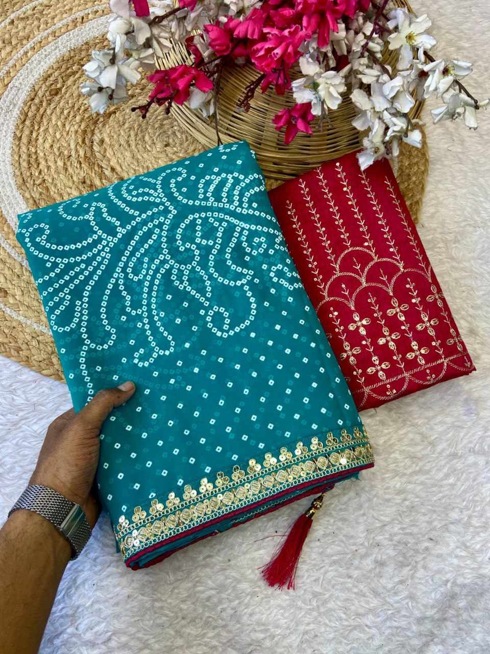 | Name : | RC Bandhej Georgette heavy Coding Sequence border Saree |